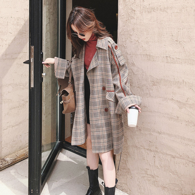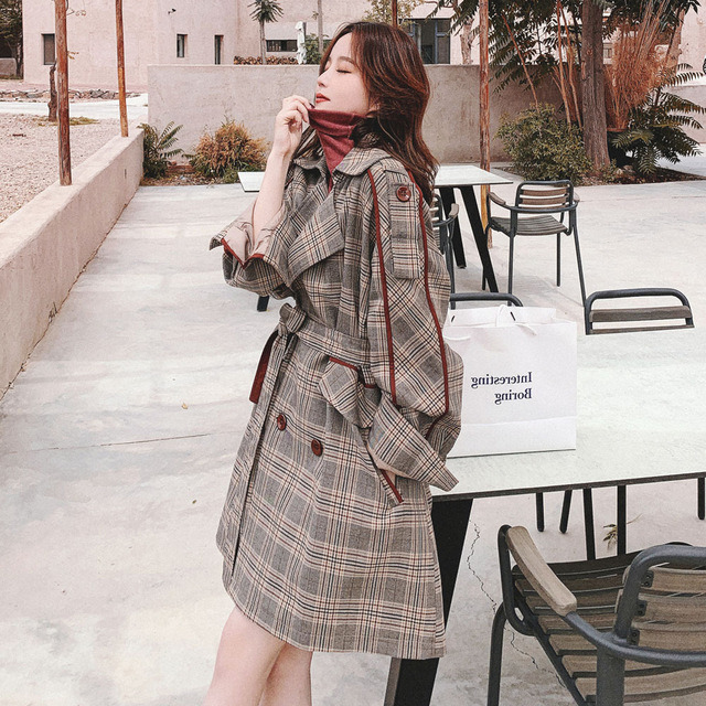 复古格子风衣女中长款小个子新款韩版宽松春秋英伦风大衣外套